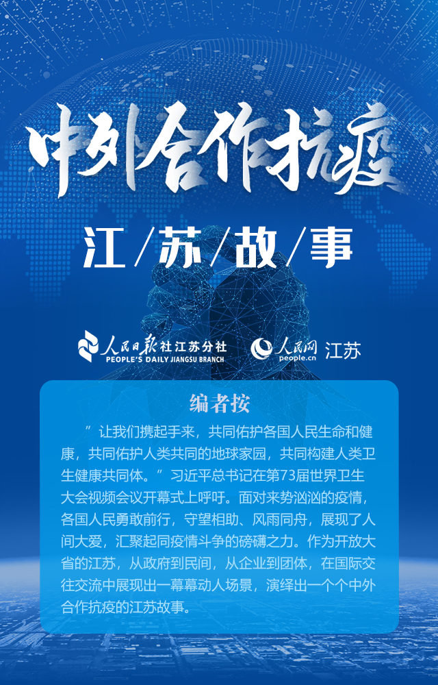 “讓我們攜起手來,共同佑護各國人民生命和健康,共同佑護人類共同的地球家園,共同構(gòu)建人類衛(wèi)生健康共同體!绷(xí)近平總書記在第73屆世界衛(wèi)生大會視頻會議開幕式上呼吁。面對來勢洶洶的疫情,各國人民勇敢前行,守望相助、風(fēng)雨同舟,展現(xiàn)了人間大愛,匯聚起同疫情斗爭的磅礴之力。作為開放大省的江蘇,從政府到民間,從企業(yè)到團體,在國際交往交流中展現(xiàn)出一幕幕動人場景,演繹出一個個中外合作抗疫的江蘇故事。