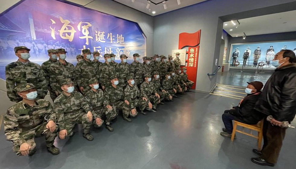 92歲的戰(zhàn)斗英雄史圣林在中國(guó)人民解放軍海軍誕生地紀(jì)念館為33名預(yù)定新兵上了一堂生動(dòng)的“軍旅第一課”。泰州市委宣傳部供圖