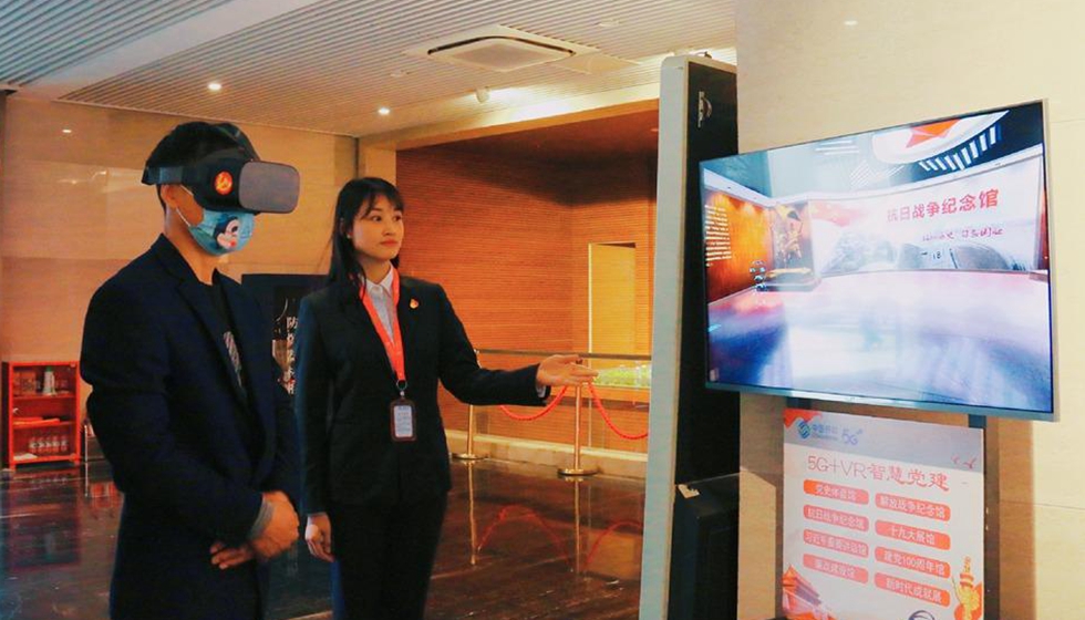 在淮安市,市民在周恩來(lái)紀(jì)念館參觀,通過(guò)5G+VR眼鏡,感受崢嶸歲月。陳芳攝