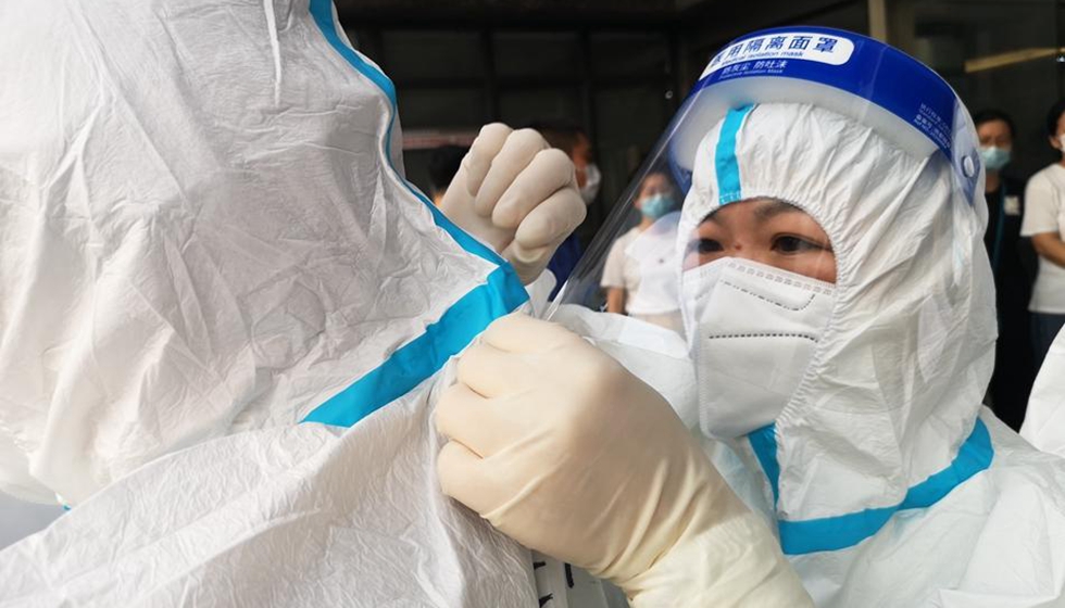 無錫志愿者在工作前相互檢查防護服是否穿著妥當