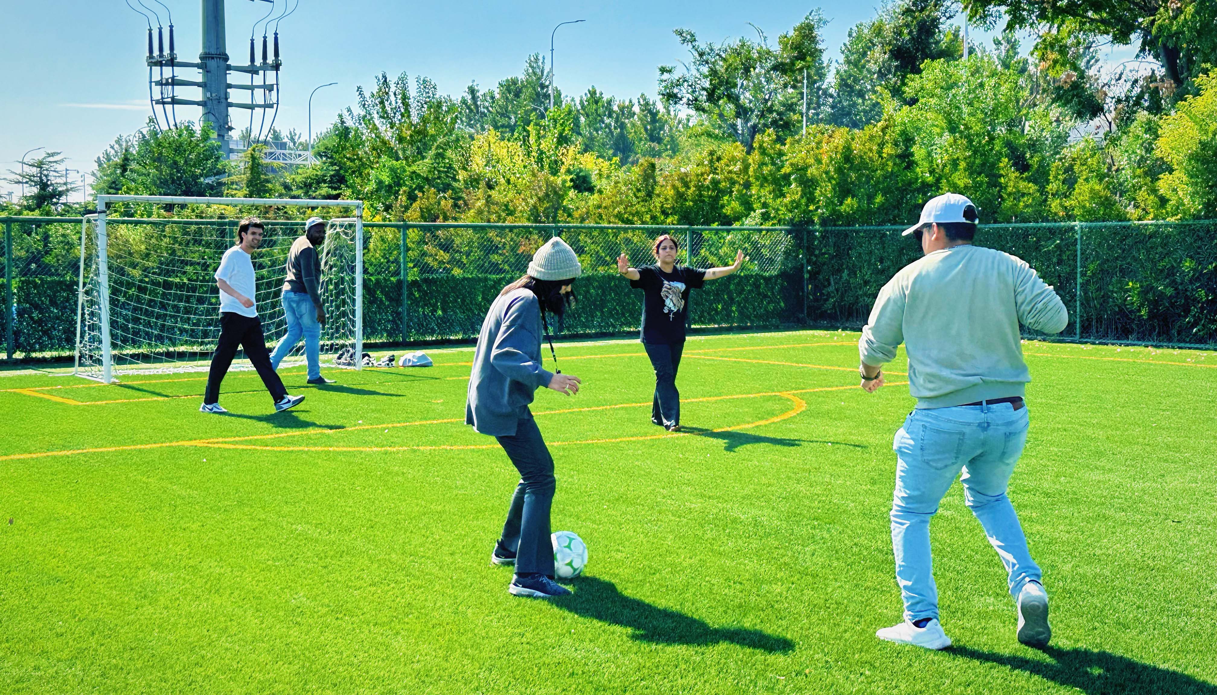 在淮安企業(yè)人造草坪體驗區(qū)踢足球。