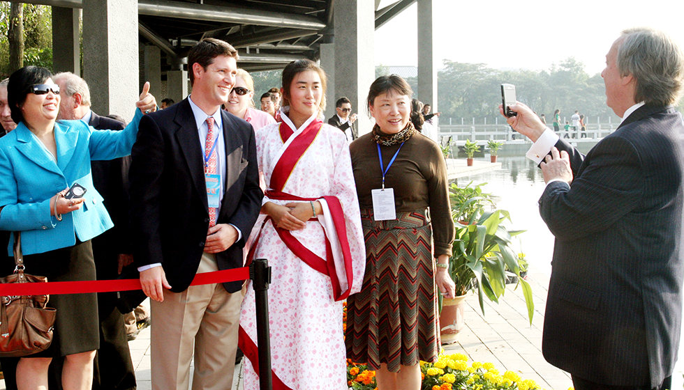 在徐州漢文化景區(qū)里,外國友人爭相與穿著漢服的演員合影。齊浩攝