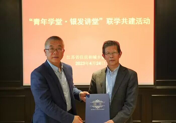 江蘇省住房和城鄉(xiāng)建設廳副廳長張鈞向張鑑頒發(fā)青年導師聘書。魯茂亮攝 日前,江蘇省住房和城鄉(xiāng)建設廳“青年學堂”與“銀發(fā)講堂”開展聯(lián)學共建活動,活動邀請省住建廳退休干部張鑑與青年代表們進行座談交流。結合數(shù)十年的工作心得,張鑑圍繞城鄉(xiāng)歷史文化保護傳承、援疆心路歷程與青年代表作深入交流,江…