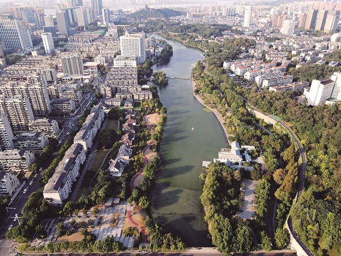 從2013年起,南京市開始對小桃園進行環(huán)境綜合整治。今年,南醫(yī)大二附院拆除了圍墻,這片區(qū)域成為“生態(tài)綠廊”和“城市公園”。圖為26日,從空中俯視小桃園,長6公里的環(huán)護城河綠道全線貫通,遠處的長江、閱江樓、繡球公園等美景一覽無余。本報記者 吳俊 攝…