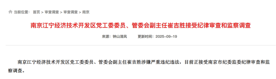 據(jù)南京市紀委監(jiān)委網(wǎng)站9月19日消息,南京江寧經(jīng)濟技術(shù)開發(fā)區(qū)黨工委委員、管委會副主任崔吉勝涉嫌嚴重違紀違法,目前正接受南京市紀委監(jiān)委紀律審查和監(jiān)察調(diào)查?!?/a>