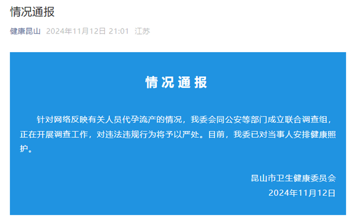 11月12日晚,昆山市衛(wèi)生健康委員會發(fā)布“情況通報”稱:針對網絡反映有關人員代孕流產的情況,我委會同公安等部門成立聯合調查組,正在開展調查工作,對違法違規(guī)行為將予以嚴處。目前,我委已對當事人安排健康照護。 來源:新華日報·交匯點…