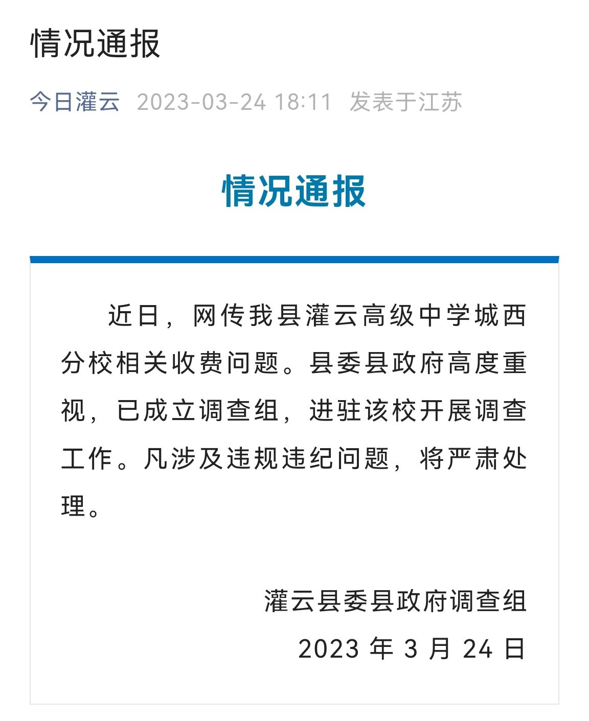 人民網(wǎng)南京3月25日電 近日,網(wǎng)傳連云港市灌云高級中學城西分校要求學生向班主任私人賬戶交6500元培養(yǎng)費,引發(fā)廣泛關(guān)注。3月24日,灌云縣委縣政府調(diào)查組發(fā)布情況通報稱,縣委縣政府高度重視,已成立調(diào)查組,進駐該校開展調(diào)查工作。凡涉及違規(guī)違紀問題,將嚴肅處理。 據(jù)相關(guān)報道,202…