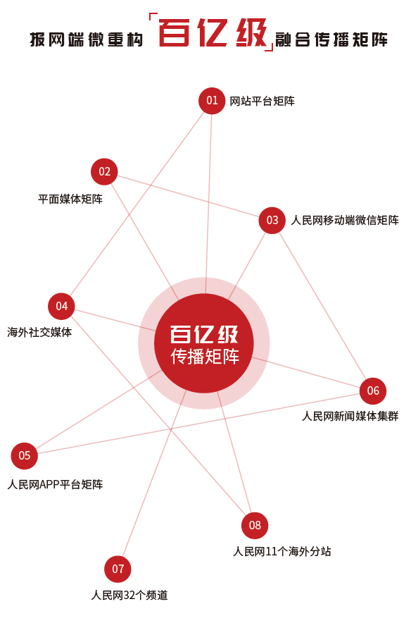 人民網(wǎng)依托以人民日報為中心的報系系統(tǒng),融合報紙、網(wǎng)站、微博、微信、客戶端、網(wǎng)絡(luò)電視等多種傳播形態(tài)的現(xiàn)代化全媒體矩陣,跨媒體跨平臺實現(xiàn)價值挖掘與傳播。