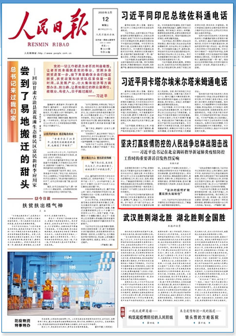 《人民日?qǐng)?bào)》2020年2月12日1版 記者:劉毅、朱競(jìng)?cè)簟⑼蹶荒、田豆豆、程遠(yuǎn)州、范昊天、吳君、鮮敢、申少鐵、白劍峰、高云才、杜海濤、許志峰、陸婭楠、歐陽(yáng)潔、馮華、吳秋余、劉志強(qiáng)、王珂、林麗鸝、齊志明、趙展慧、李心萍、丁怡婷、韓鑫、江南、何勇、朱磊、賀林平、王偉健、蔣云龍、朱佩嫻、程煥、徐靖