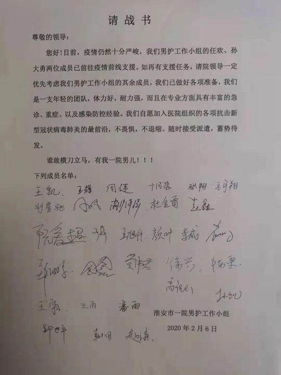 淮安市第一人民醫(yī)院男護工作小組請戰(zhàn)書