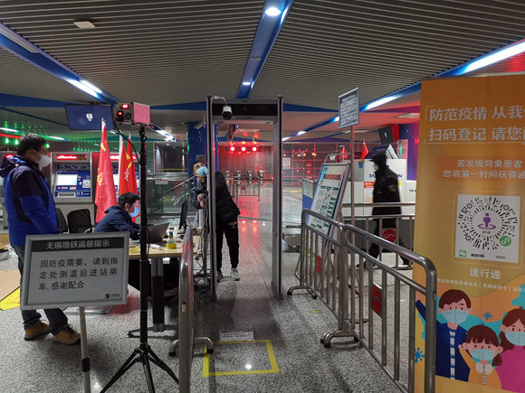 圖為無錫東站地鐵站進(jìn)站口設(shè)置的“AI熱成像人體測溫篩選系統(tǒng)”。