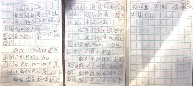 編者按:時下,新冠肺炎疫情防控工作到了最吃勁的關鍵階段。一段時間以來,各級黨員干部、醫(yī)護人員、警務人員、基層網(wǎng)格員等紛紛走上戰(zhàn)“疫”一線,也涌現(xiàn)了一批感人至深的請戰(zhàn)書、入黨申請書、家書、公開信等,其中不少書信情真意切,飽含熱度。為鼓舞士氣,弘揚正氣,人民網(wǎng)推出《戰(zhàn)“疫”書信》欄目。本次刊發(fā)的是無錫市中醫(yī)醫(yī)院護士、第二批援鄂醫(yī)療隊隊員趙毅飛的女兒楊浠晨寫給媽媽的一封信以及趙毅飛給女兒的回信。