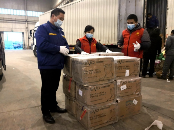 徐工集團(tuán)為海外友商捐贈(zèng)的防疫物資打包起運(yùn)。王盛攝