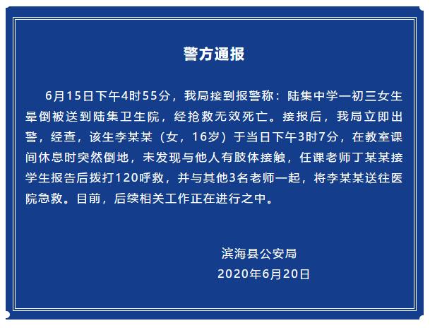 6月15日下午4時55分,濱?h公安局接到報警稱:陸集中學一初三女生暈倒被送到陸集衛(wèi)生院,經(jīng)搶救無效死亡。接報后,我局立即出警,經(jīng)查,該生李某某(女,16歲)于當日下午3時7分,在教室課間休息時突然倒地,未發(fā)現(xiàn)與他人有肢體接觸,任課老師丁某某接學生報告后撥打120呼救,并與其他3名老師一起,將李某某送往醫(yī)院急救。目前,后續(xù)相關工作正在進行之中。