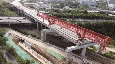 南京市光華路東延工程預(yù)計今年底全線貫通。通車后將直連麒麟與南部新城、主城區(qū),解決麒麟科創(chuàng)園區(qū)、光華路、雙麒路及周邊道路出行擁堵問題。圖為4日,工人們冒著烈日加緊施工。 本報記者 樂 濤攝