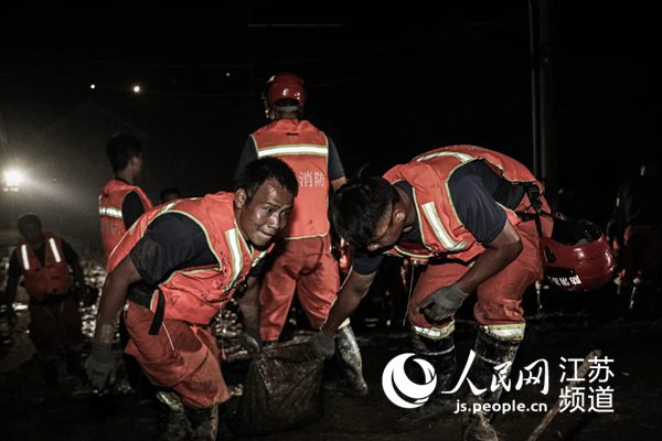 南通消防救援支隊(duì)夜間組織指戰(zhàn)員繼續(xù)做好筑堤巡堤工作。