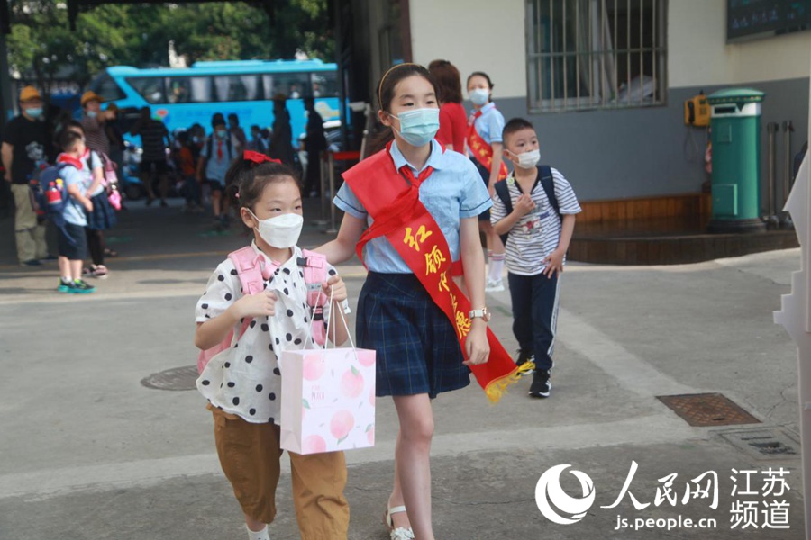 在紅領(lǐng)巾志愿者的引領(lǐng)下,揚州市東關(guān)小學(xué)的新生安全有序步入校園。 校方供圖