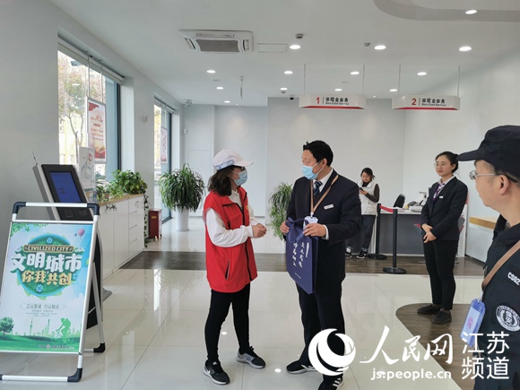 興化市科協(xié)工作人員在包保區(qū)域發(fā)放創(chuàng)建文明城市主題帆布袋。人民網(wǎng)馬曉波攝
