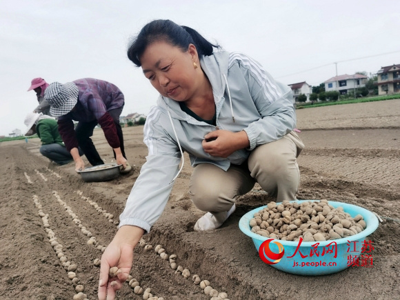 海安市角斜鎮(zhèn)來南村少數(shù)民族群眾劉曉琴正在自家田里種植貝母。記者王繼亮攝