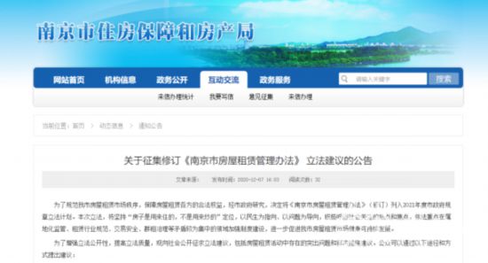 今天(12月8日),南京市住房保障和房產(chǎn)局發(fā)布關(guān)于征集修訂《南京市房屋租賃管理辦法》立法建議的公告。公告表示,為了規(guī)范房屋租賃市場秩序,保障房屋租賃各方的合法權(quán)益,《南京市房屋租賃管理辦法》(修訂)將被列入2021年度市政府規(guī)章立法計(jì)劃,現(xiàn)向社會公開征求立法建議。