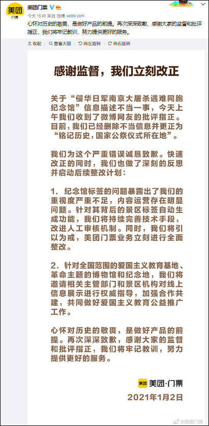 1月2日下午,美團(tuán)門票在微博上道歉聲明稱,關(guān)于“侵華日軍南京大屠殺遇難同胞紀(jì)念館”信息描述不當(dāng)一事,該平臺已收到微博網(wǎng)友的批評指正。目前,平臺已經(jīng)刪除不當(dāng)信息并更正為“銘記歷史,國家公祭儀式所在地”。