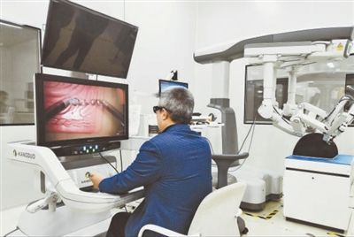 工作人員體驗(yàn)蘇州康多研發(fā)的國(guó)產(chǎn)腹腔鏡手術(shù)機(jī)器人。 蘇州高新區(qū)供圖