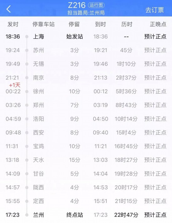 Z216次列車始發(fā)站為上海,終點(diǎn)站為蘭州,期間經(jīng)過蘇州、無錫、南京、徐州等地。