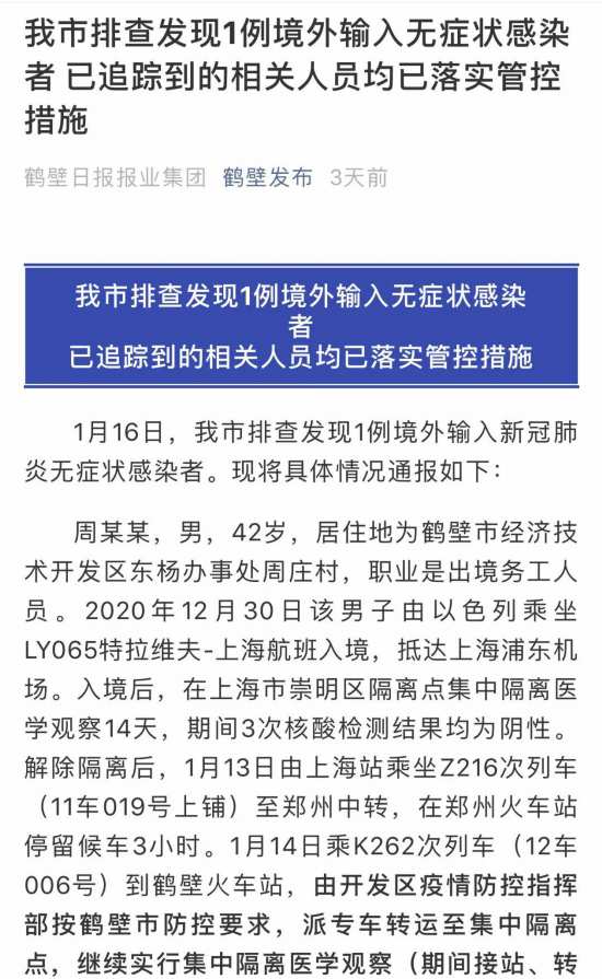 李某某,男,32歲,居住地為?h小河鎮(zhèn)前同山村,職業(yè)是出境務(wù)工人員。2020年12月30日該男子由以色列乘坐LY065特拉維夫-上海航班入境,抵達(dá)上海浦東機(jī)場(chǎng)。入境后,在上海市崇明區(qū)隔離點(diǎn)集中隔離醫(yī)學(xué)觀察14天,期間3次核酸檢測(cè)結(jié)果均為陰性。解除隔離后,1月13日由上海站乘坐Z216次列車(11車018號(hào)上鋪)至鄭州中轉(zhuǎn),在鄭州火車站停留候車3小時(shí)。1月14日乘K262次列車(13車33號(hào))到鶴壁火車站,由?h疫情防控指揮部按鶴壁市防控要求,派專車轉(zhuǎn)運(yùn)至集中隔離點(diǎn),繼續(xù)實(shí)行集中隔離醫(yī)學(xué)觀察(期間接站、轉(zhuǎn)運(yùn)、隔離等整個(gè)過程均實(shí)行閉環(huán)管理)。1月17日經(jīng)鶴壁市疾控中心檢測(cè)核酸結(jié)果陽性。綜合流行病學(xué)史、臨床表現(xiàn)及實(shí)驗(yàn)室檢測(cè)結(jié)果,專家組判定為無癥狀感染者。按照疫情防控有關(guān)要求,該無癥狀感染者已被轉(zhuǎn)送至鄭州大學(xué)第一附屬醫(yī)院進(jìn)行隔離醫(yī)學(xué)觀察。