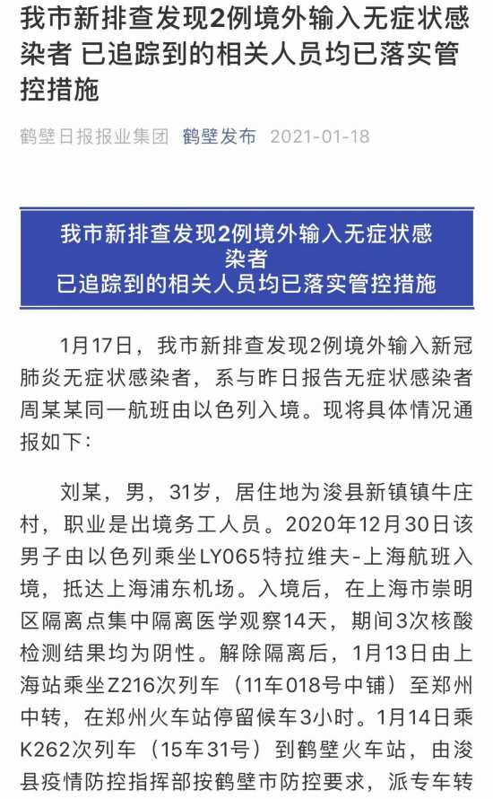 據(jù)鶴壁發(fā)布1月18日消息,1月17日,鶴壁市新排查發(fā)現(xiàn)2例境外輸入新冠肺炎無癥狀感染者,系與昨日?qǐng)?bào)告無癥狀感染者周某某同一航班由以色列入境。現(xiàn)將具體情況通報(bào)如下: