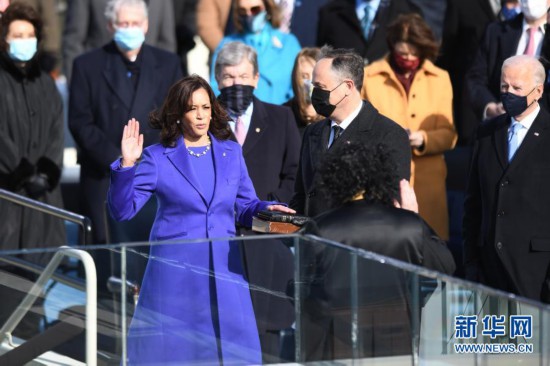 美國當(dāng)選副總統(tǒng)哈里斯當(dāng)天也宣誓就職,成為美國歷史上首位女性副總統(tǒng)。