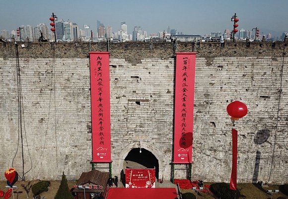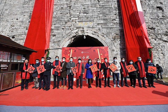 “一百年歲月流金,大業(yè)有成,射斗龍光騰古國(guó);九萬(wàn)里河山聚寶,中華無(wú)恙,沖天牛氣數(shù)今朝!” 1月30日上午,由南京市文化和旅游局、新華報(bào)業(yè)傳媒集團(tuán)、中國(guó)銀行江蘇省分行主辦的2021年第六季“城門掛春聯(lián) 南京開(kāi)門紅”揭聯(lián)儀式在中華門舉行。