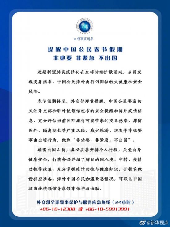據(jù)外交部“領(lǐng)事直通車”微信公眾號消息:近期新冠肺炎疫情仍在全球持續(xù)擴(kuò)散蔓延,多國發(fā)現(xiàn)變異病毒,中國公民海外出行仍面臨較大健康和安全風(fēng)險(xiǎn)。春節(jié)假期將至,外交部鄭重提醒,中國公民要密切關(guān)注外交部和駐外使領(lǐng)館發(fā)布的安全提醒和海外疫情信息,充分評估當(dāng)前國際旅行可能帶來的交叉感染、滯留國外、隔離期長等嚴(yán)重風(fēng)險(xiǎn)。減少旅游、訪友等非必要事由出境行為,做到“非必要,非緊急,不出國”。(記者徐鵬航)