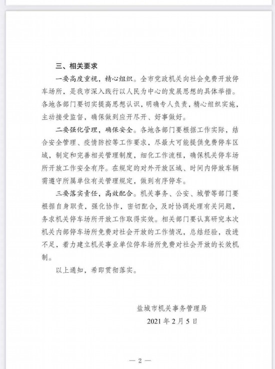 據(jù)悉,鹽城市黨政機(jī)關(guān)免費(fèi)開放停車場所的時間為2021年2月10日18:00至2月17日18:00。車輛進(jìn)入鹽城市行政中心,駕駛?cè)藛T需提前準(zhǔn)備好車輛行駛證和駕駛證復(fù)印件,進(jìn)入大門前交門衛(wèi)人員核驗;根據(jù)防疫要求,駕駛?cè)藛T需配戴口罩、提供本人健康碼,經(jīng)測量體溫,并預(yù)留聯(lián)系電話,領(lǐng)取停車憑證后方可進(jìn)入;實行人車分流,隨車乘客一律在門外下車,不得進(jìn)入市行政中心院內(nèi);進(jìn)入市行政中心院內(nèi)的車輛,須服從統(tǒng)一管理,在安保人員引導(dǎo)下,前往停車地點,車輛停放好后,駕駛?cè)藛T需從原路返回,不得在大院內(nèi)逗留;停放車輛如需離開市行政中心,門衛(wèi)人員查驗駕駛?cè)藛T停車憑證后放行;所有停放車輛不能超過規(guī)定停放時間,過時將進(jìn)行清障處理。