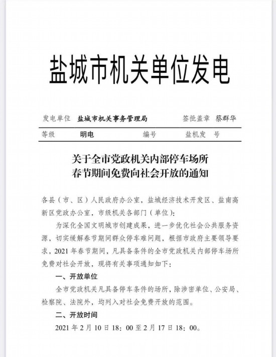 交匯點訊 春節(jié)期間,除涉密單位、公安局、檢察院、法院外,全鹽城市黨政機(jī)關(guān)凡具備停車條件的場所,均列入對社會免費(fèi)開放的范圍,大約能提供近2萬個免費(fèi)停車位。記者從鹽城市機(jī)關(guān)事務(wù)管理局了解到,這是鹽城首次將黨政機(jī)關(guān)停車場免費(fèi)向社會開放,切實緩解春節(jié)期間停車難問題,為群眾出行提供便利。