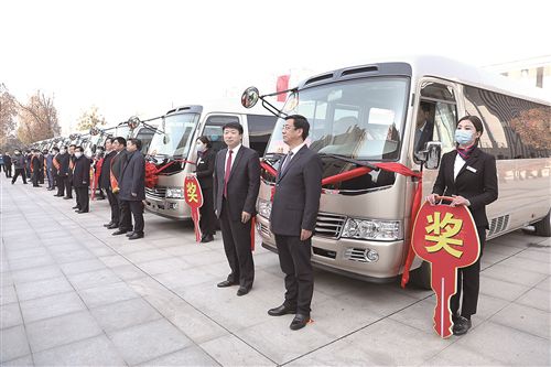 2月19日,11:20,在沛縣文化中心會場南廣場,上海大屯能源股份有限公司董事長包正明從沛縣縣委書記吳昊手里接過了豐田考斯特的“鑰匙”,另外9家企業(yè)的負(fù)責(zé)人也分別從縣領(lǐng)導(dǎo)手里一一接過“鑰匙”,這10家企業(yè)有一個共同的身份——2020年度沛縣財政貢獻(xiàn)十強(qiáng)企業(yè)。