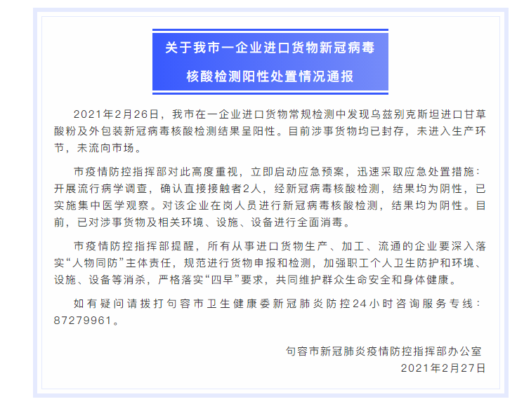 據(jù)句容市新冠肺炎疫情防控指揮部辦公室,2021年2月26日,句容市在一企業(yè)進(jìn)口貨物常規(guī)檢測中發(fā)現(xiàn)烏茲別克斯坦進(jìn)口甘草酸粉及外包裝新冠病毒核酸檢測結(jié)果呈陽性。目前涉事貨物均已封存,未進(jìn)入生產(chǎn)環(huán)節(jié),未流向市場。