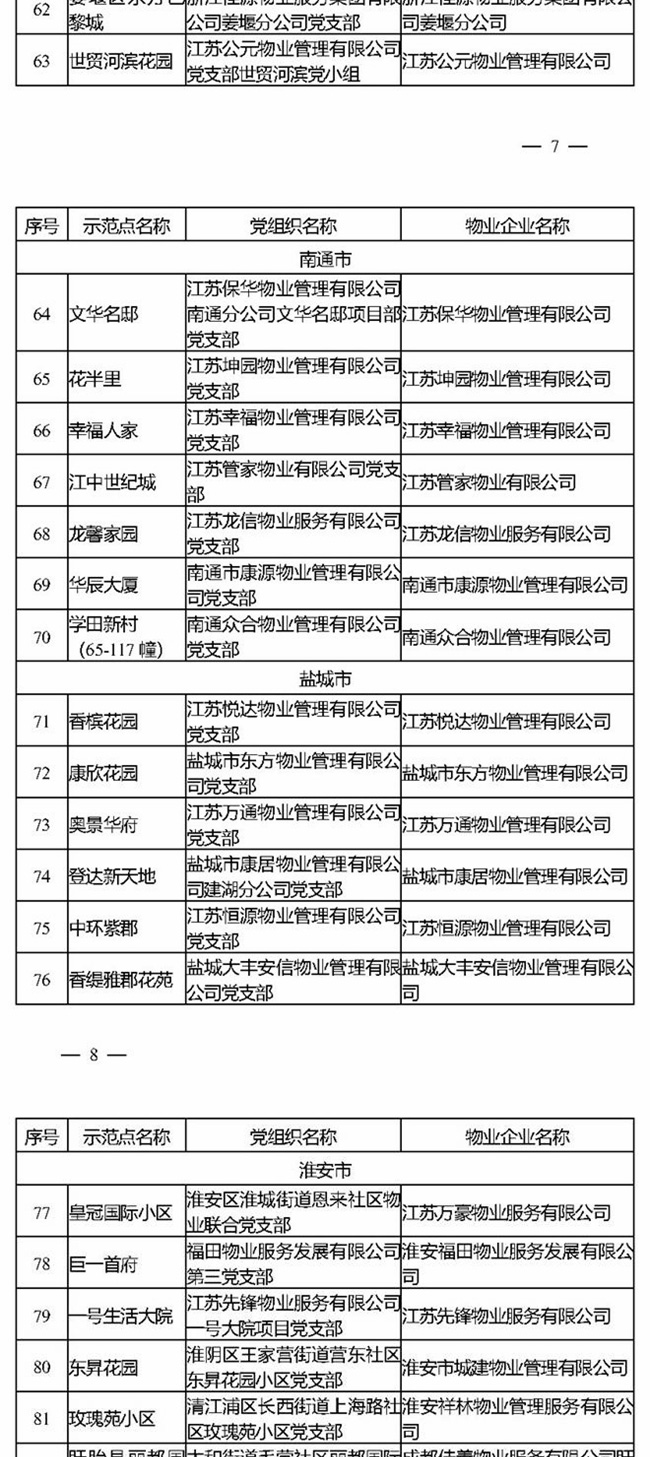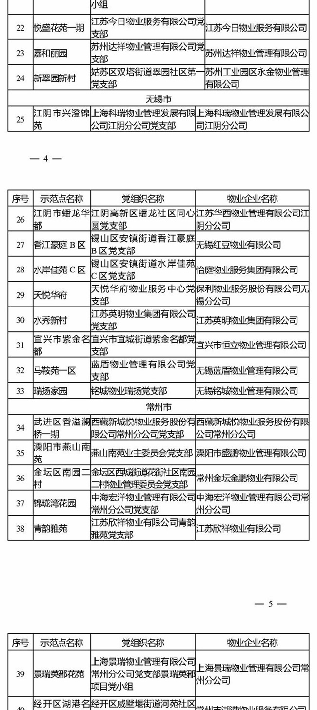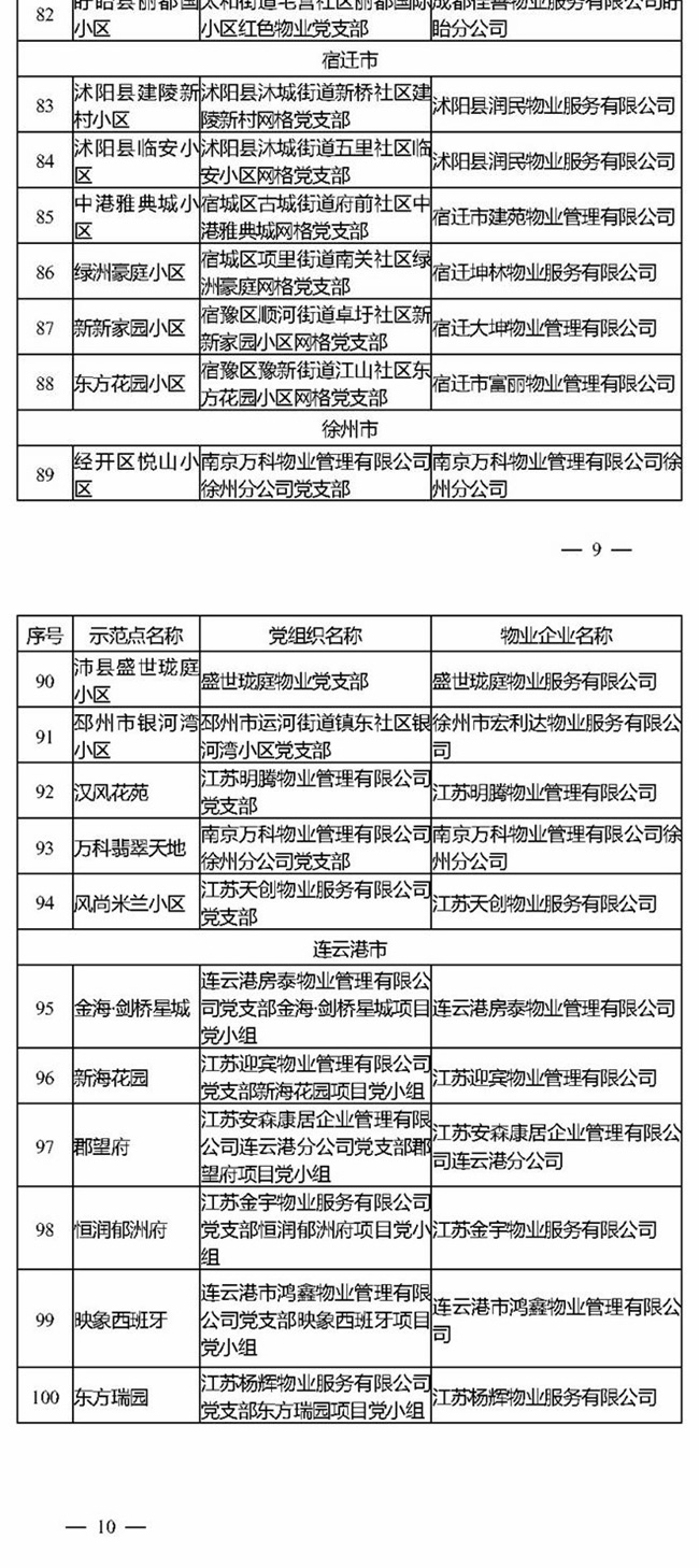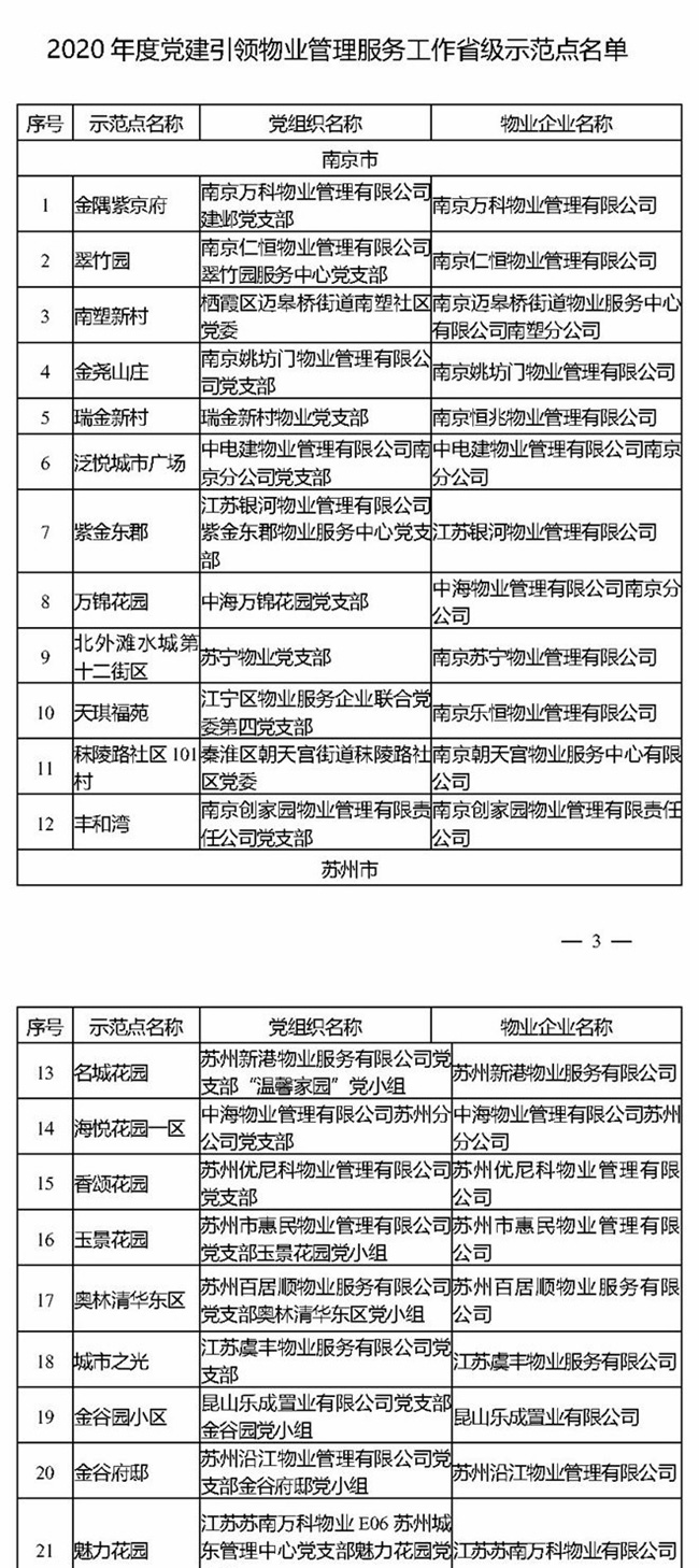 近日,江蘇省委組織部、江蘇省委非公有制企業(yè)和社會(huì)組織工作委員會(huì)、江蘇省住房和城鄉(xiāng)建設(shè)廳黨組、江蘇省住房和城鄉(xiāng)建設(shè)行業(yè)委員會(huì)聯(lián)合發(fā)出通知,決定命名100個(gè)項(xiàng)目為《2020年度黨建引領(lǐng)物業(yè)管理服務(wù)工作省級(jí)示范點(diǎn)》。