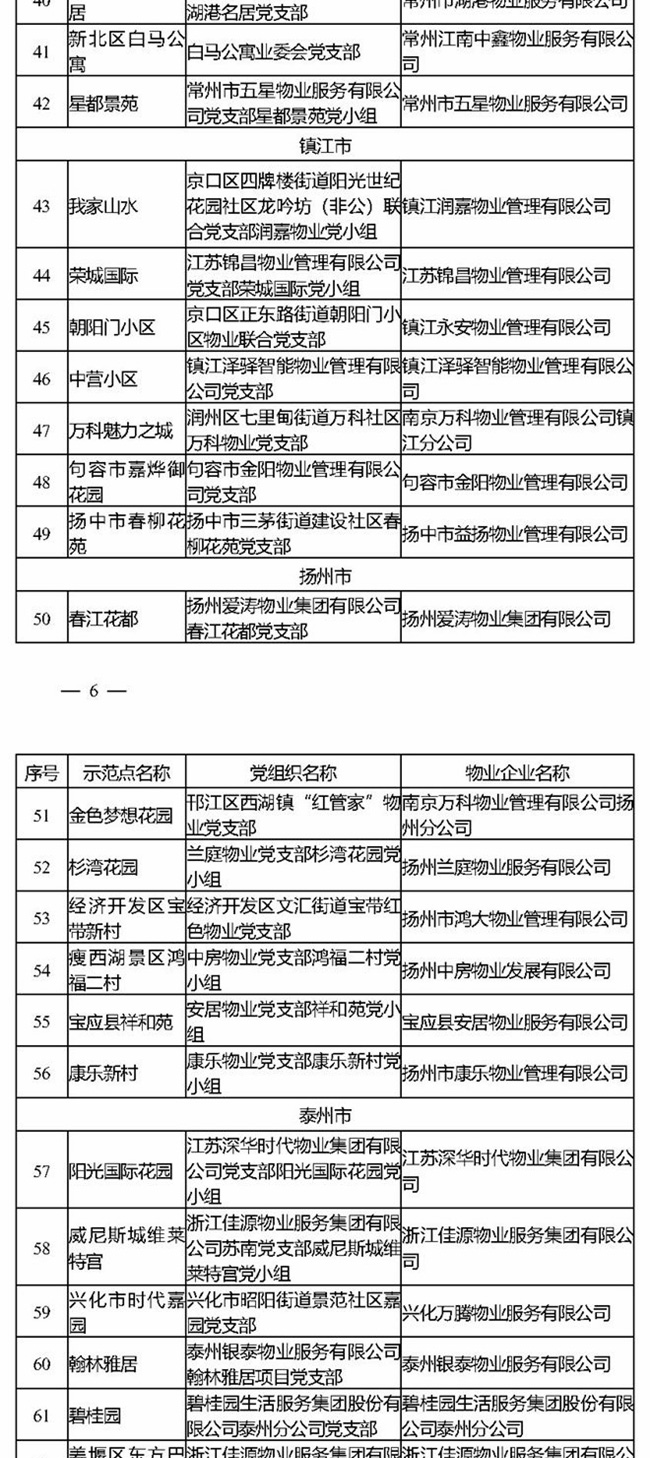 深入推進(jìn)黨建引領(lǐng)物業(yè)管理服務(wù),是切實(shí)發(fā)揮黨的政治優(yōu)勢(shì)、組織優(yōu)勢(shì),破解物業(yè)管理難題,不斷提升群眾獲得感幸福感安全感的創(chuàng)新實(shí)踐,對(duì)推動(dòng)江蘇省社會(huì)治理體系和治理能力現(xiàn)代化、加快構(gòu)建共建共治共享的社會(huì)治理格局具有重要意義。2020年以來(lái),江蘇省各地各單位以打造一批“紅色物業(yè)”黨群服務(wù)陣地、匯聚一批以黨員為骨干的“紅色物業(yè)”團(tuán)隊(duì)、實(shí)施一批解決居民群眾關(guān)注難點(diǎn)痛點(diǎn)問(wèn)題的“紅色物業(yè)”服務(wù)項(xiàng)目為重點(diǎn),大力開(kāi)展黨建引領(lǐng)物業(yè)管理服務(wù)工作省級(jí)示范點(diǎn)創(chuàng)建工作,取得了較好成效,涌現(xiàn)出一批黨建賦能、多元參與、合力攻堅(jiān)的創(chuàng)新案例和優(yōu)秀典型。為表彰先進(jìn)、帶動(dòng)共進(jìn),充分發(fā)揮示范引領(lǐng)作用,決定命名100個(gè)項(xiàng)目為2020年度黨建引領(lǐng)物業(yè)管理服務(wù)工作省級(jí)示范點(diǎn)。