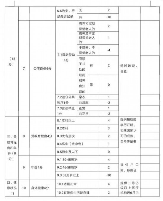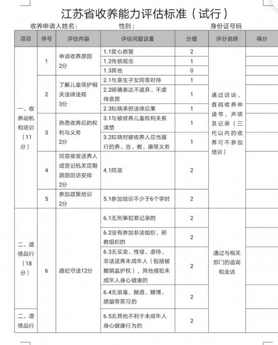 新標準專門設(shè)立18分的分值,對收養(yǎng)人或家庭的道德品行進行評估,收養(yǎng)人必須吻合時代精神要求,必須品行端正和遵守公序良俗。