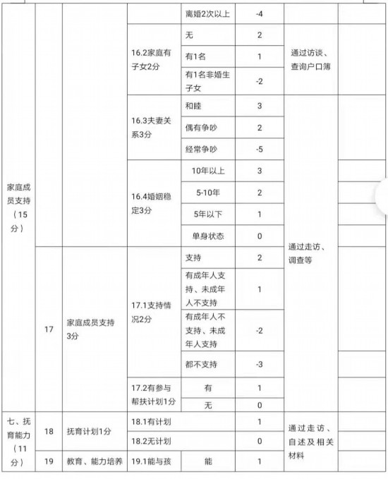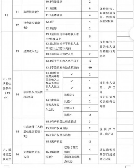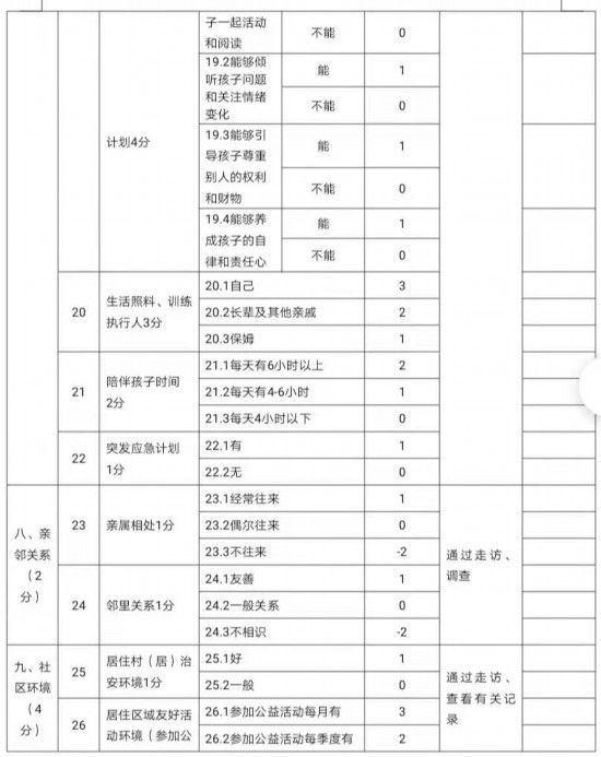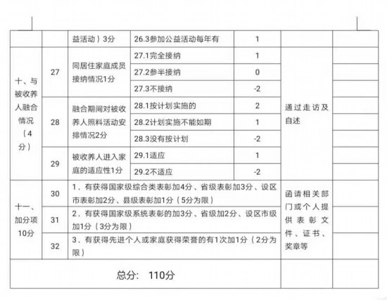 《評估標準》共設(shè)十一類32個大項88個小項,包括收養(yǎng)動機和培訓(xùn)、道德品行、受教育程度和年齡、健康狀況、經(jīng)濟及住房條件、婚姻穩(wěn)定及同住家庭成員支持、撫養(yǎng)能力、親鄰關(guān)系、社區(qū)環(huán)境、與被收養(yǎng)人融合情況和加分項等內(nèi)容?偡种110分,75分為合格。