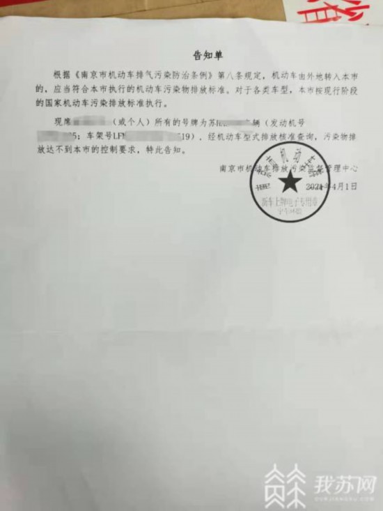 隨后,席先生向記者提供了一份南京市機動車排放污染監(jiān)督管理中心發(fā)放的《告知單》,明確表示,這輛豐田花冠的污染物排放達不到南京市的排放標準。