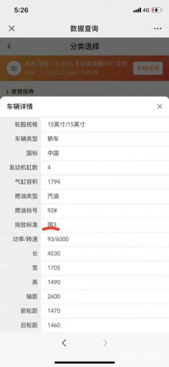 通過軟件查詢他才發(fā)現(xiàn),這輛豐田花冠其實就是國三排放的車子。