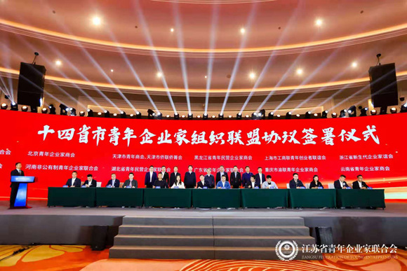 圖為十四省市青年企業(yè)家組織聯(lián)盟協(xié)議簽署儀式現(xiàn)場(chǎng)