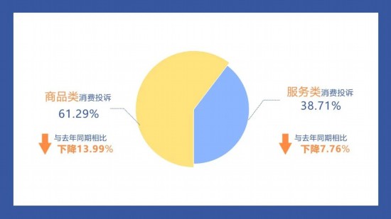 一季度,全省12315熱線平臺(tái)共受理投訴6.2萬(wàn)件,其中商品類(lèi)投訴3.8萬(wàn)件,占總投訴量的61.29%,同比下降13.99%;服務(wù)類(lèi)投訴2.4萬(wàn)件,占總投訴量的38.71%,同比下降7.76%。