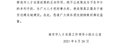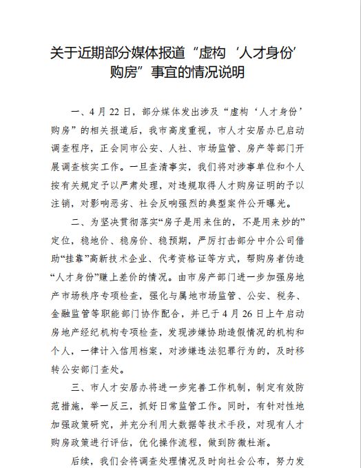 4月26日,南京市人才安居工作領(lǐng)導(dǎo)小組辦公室作出官方回應(yīng)《關(guān)于近期部分媒體報(bào)道“虛構(gòu)‘人才身份’購房”事宜的情況說明》。回應(yīng)中表示,“4月22日,部分媒體發(fā)出涉及“虛構(gòu)‘人才身份’購房”的相關(guān)報(bào)道后,我市高度重視,市人才安居辦已啟動(dòng)調(diào)查程序,正會(huì)同市公安、人社、市場監(jiān)管、房產(chǎn)等部門開展調(diào)查核實(shí)工作。一旦查清事實(shí),我們將對涉事單位和個(gè)人按有關(guān)規(guī)定予以嚴(yán)肅處理,對違規(guī)取得人才購房證明的予以注銷,對影響惡劣、社會(huì)反響強(qiáng)烈的典型案件公開曝光。”文件中還表示,南京市房產(chǎn)部門已于4月26日上午啟動(dòng)房地產(chǎn)經(jīng)紀(jì)機(jī)構(gòu)專項(xiàng)檢查,發(fā)現(xiàn)涉嫌協(xié)助造假情況的機(jī)構(gòu)和個(gè)人,一律計(jì)入信用檔案,對涉嫌違法犯罪行為的,及時(shí)移轉(zhuǎn)公安部門查處。下一步,南京市人才安居辦將進(jìn)一步完善工作機(jī)制,制定有效防范措施,舉一反三,抓好日常監(jiān)管工作。市人才安居辦將進(jìn)一步完善工作機(jī)制,制定有效防范措施,舉一反三,抓好日常監(jiān)管工作。同時(shí),有針對性地加強(qiáng)政策研究,并充分利用大數(shù)據(jù)等技術(shù)手段,對現(xiàn)有人才購房政策進(jìn)行評估,優(yōu)化操作流程,做到防微杜漸。
