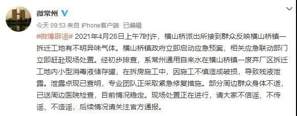 人民網(wǎng)常州4月28日電 (馬燾燾)人民網(wǎng)從常州市經(jīng)濟(jì)開(kāi)發(fā)區(qū)獲悉,4月28日上午7時(shí)許,常州通用自來(lái)水公司在橫山橋鎮(zhèn)一廢棄廠區(qū)拆遷工地內(nèi)的小型消毒液儲(chǔ)存罐,拆房施工中,因施工不慎造成破損,導(dǎo)致殘液泄露。