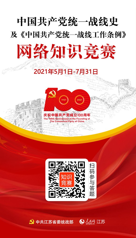 為深入推進學習貫徹習近平總書記關于加強和改進統(tǒng)一戰(zhàn)線工作的重要思想和《中國共產(chǎn)黨統(tǒng)一戰(zhàn)線工作條例》,推動黨史學習教育走深走實,5月1日,江蘇省委統(tǒng)戰(zhàn)部組織開展的中國共產(chǎn)黨統(tǒng)一戰(zhàn)線史及《中國共產(chǎn)黨統(tǒng)一戰(zhàn)線工作條例》網(wǎng)絡知識競賽將正式上線。