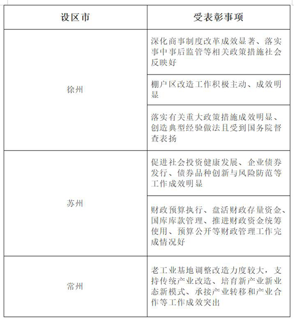 在江蘇省13個設(shè)區(qū)市中,徐州、蘇州、常州分別受到表彰。其中徐州在深化商事制度改革成效顯著、落實(shí)事中事后監(jiān)管等相關(guān)政策措施社會反映好;棚戶區(qū)改造工作積極主動、成效明顯;落實(shí)有關(guān)重大政策措施成效明顯、創(chuàng)造典型經(jīng)驗(yàn)做法且受到國務(wù)院督查表揚(yáng)三個方面獲得督查激勵。蘇州市促進(jìn)社會投資健康發(fā)展、企業(yè)債券發(fā)行、債券品種創(chuàng)新與風(fēng)險防范等工作成效明顯;財(cái)政預(yù)算執(zhí)行、盤活財(cái)政存量資金、國庫庫款管理、推進(jìn)財(cái)政資金統(tǒng)籌使用、預(yù)算公開等財(cái)政管理工作完成情況好,根據(jù)通報(bào),2021年蘇州市將獲得利用年度預(yù)算中單獨(dú)安排的資金等獎勵,獎勵資金不低于2000萬元。常州老工業(yè)基地調(diào)整改造力度較大,支持傳統(tǒng)產(chǎn)業(yè)改造、培育新產(chǎn)業(yè)新業(yè)態(tài)新模式、承接產(chǎn)業(yè)轉(zhuǎn)移和產(chǎn)業(yè)合作等工作成效突出,在安排產(chǎn)業(yè)轉(zhuǎn)型升級示范區(qū)和重點(diǎn)園區(qū)建設(shè)中央預(yù)算內(nèi)資金時各獎勵2000萬元。