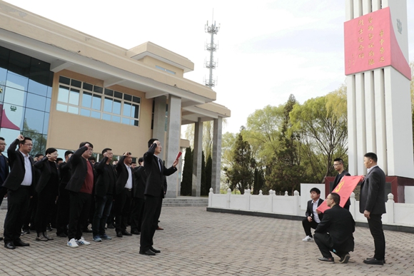 建湖煙草全體黨員在華中魯藝殉難烈士紀念碑前重溫入黨誓詞。陳志崗攝