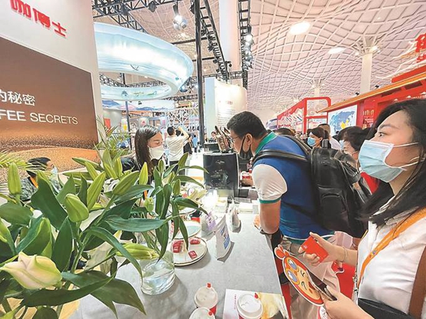 消博會江蘇展區(qū)“咖博士”展臺體驗者排起長隊。 李睿哲 攝
